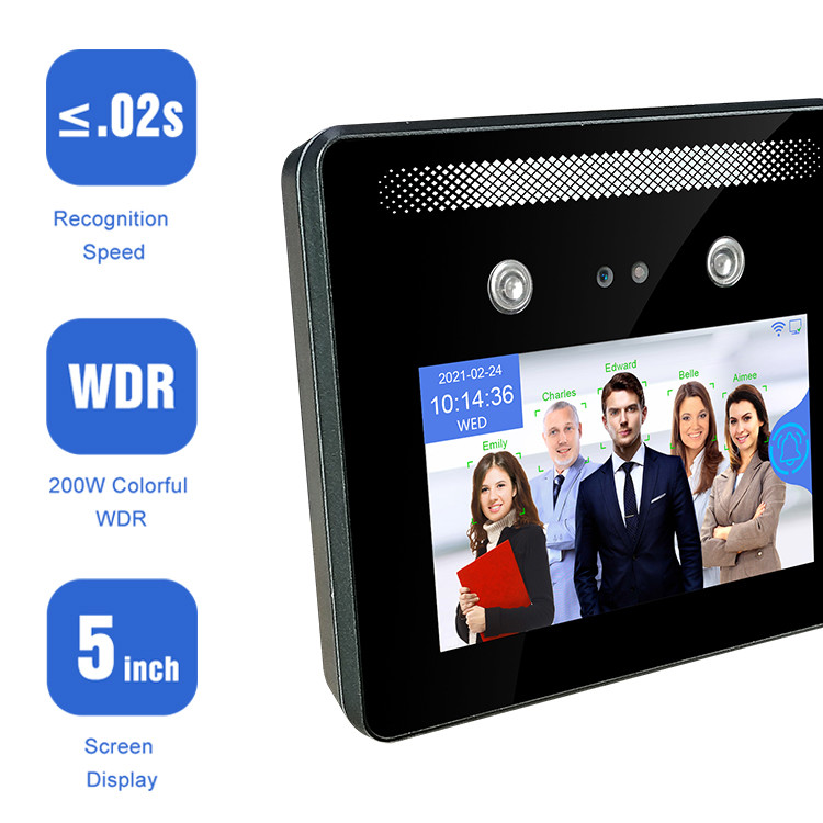 Quando trabalha uma máquina do comparecimento do tempo, pode apoiar a cara, cartão do rfid e a senha, método da identificação do código de QR, igualmente seu projeto horizontal da visualização ótica de 5 polegadas pode permitir 5 pessoas enfrenta a verificação na mostra e na detecção da tela. O dispositivo AI05 adota a tecnologia de WDR, ele pode bem trabalhar na reflexão brilhante da luz solar. Quando o dispositivo AI05 funciona uma máquina do controle de acesso, pode apoiar a detecção da máscara, e a pessoa da limitação do acesso do fuso horário com certeza ou determinado período de tempo. qual pode controlar o acesso com gestão da autoridade.